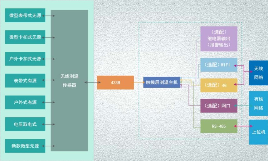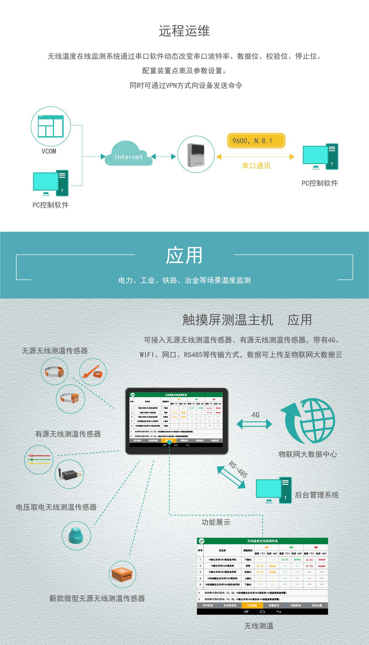 無線溫度監(jiān)測系統(tǒng)具有極高的可靠性和安全性,可直接安裝到每臺高壓開關(guān)、母線接頭、戶外刀閘、變壓器等容易產(chǎn)生高溫的電氣接點處。系統(tǒng)配備標準通訊接口,可聯(lián)網(wǎng)運行。通過上位機軟件,可記錄高壓設(shè)備實時運行溫度的數(shù)據(jù)。為高壓設(shè)備的維修提供歷史數(shù)據(jù),實現(xiàn)了高壓設(shè)備熱故障預(yù)知維護。