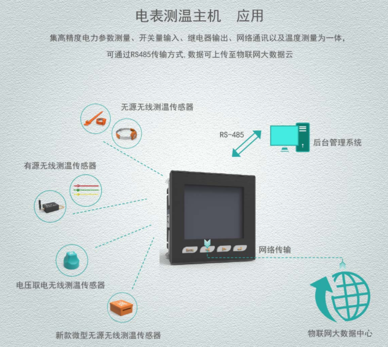 ● 管理傳感器數(shù)量:最多可接入24只無線測溫傳感器,無線頻率:433MHz