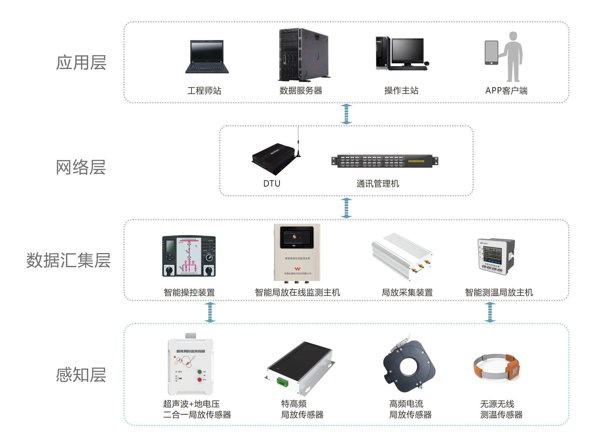 為適應(yīng)開(kāi)關(guān)柜、電纜的不停電狀態(tài)檢修工作的發(fā)展要求,基于物聯(lián)網(wǎng)、智能傳感器等智能化技術(shù),實(shí)現(xiàn)不停電狀態(tài)下的電力設(shè)備運(yùn)行狀態(tài)監(jiān)測(cè),通過(guò)暫態(tài)地電壓(TEV)、超聲波(AE&Ultrasonic)、特高頻(UHF)、高頻電流(HFCT)、溫度等智能傳感器監(jiān)測(cè)技術(shù),實(shí)現(xiàn)對(duì)開(kāi)關(guān)柜、電力電纜運(yùn)行狀態(tài)的智能感知。通過(guò)智能診斷算法、多維度對(duì)比分析,實(shí)現(xiàn)監(jiān)測(cè)數(shù)據(jù)的智能分析、設(shè)備狀態(tài)的智能診斷,實(shí)時(shí)掌握運(yùn)行狀態(tài),及時(shí)發(fā)現(xiàn)缺陷問(wèn)題,評(píng)估推送異常信息及檢修策略建議,為運(yùn)維人員制定檢修策略提供數(shù)據(jù)支持,有效避免突發(fā)停電、火災(zāi)以及人身、設(shè)備傷害事件的發(fā)生。