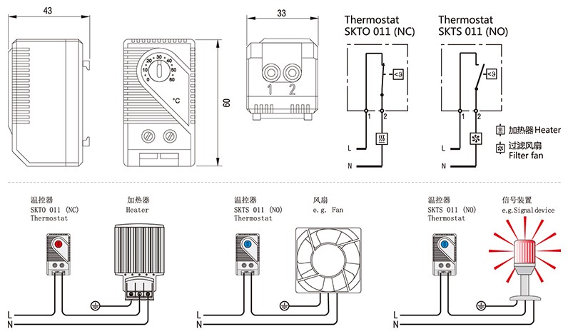 SKTS 011:溫控器(常開(kāi)NO),當(dāng)溫度超出設(shè)定值時(shí)開(kāi)關(guān)裝置可以啟動(dòng)風(fēng)機(jī)或信號(hào)裝置。(常開(kāi)旋鈕為藍(lán)色)