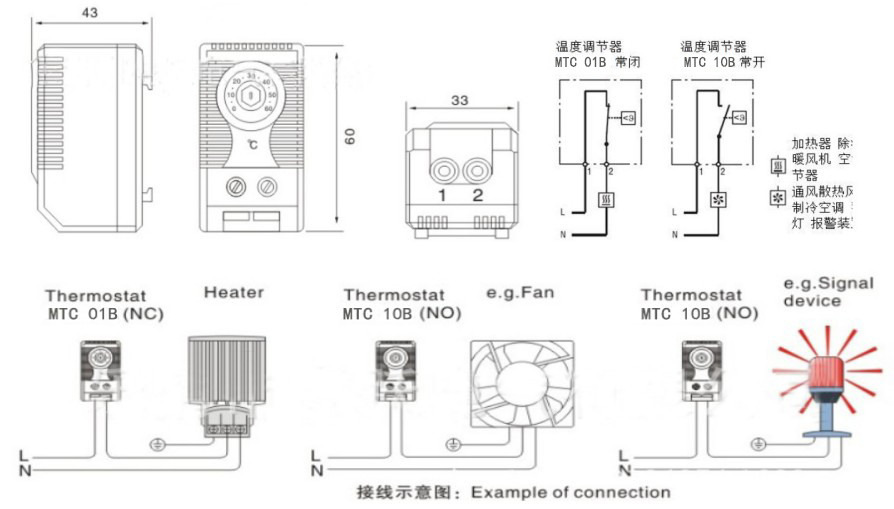 MTC 01B 瞬動常閉觸點(SPST-NC 設(shè)定旋鈕紅色表示)適用于加熱、除濕控制。